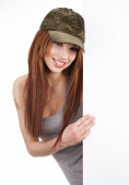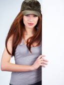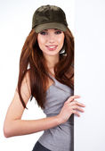 piękna kobieta trzymając pusty pokładzie biały
