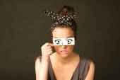 Młoda głupia dziewczyna patrząc z ręcznie rysowane gałki oczne na papierze
