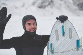 portret mężczyzny młodych kitsurf na plaży przy zachodzie słońca