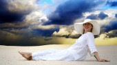 młode piękne kobiety w biały, wypoczynek w słonecznej pustyni