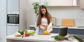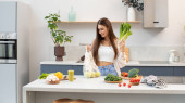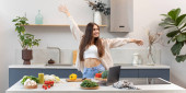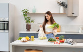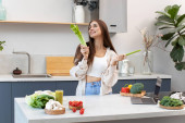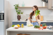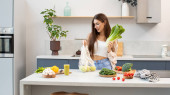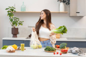 Zdjęcie "Atrakcyjna brunetka wyciąga świeże warzywa z torby wielokrotnego użytku. Koncepcja zdrowego odżywiania. Wegetarianizm." może być wykorzystywane do celów osobistych i komercyjnych zgodnie z warunkami zakupionej licencji Royalty-free. Obraz jest dostępny do pobrania w jakości wysokiej rozdzielczości do 5760x3840.