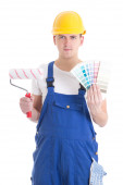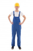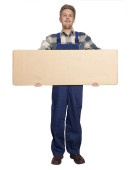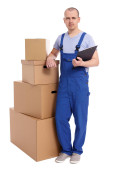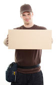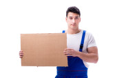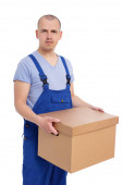 koncepcja dostawy - człowiek w odzieży roboczej z karton na białym tle o
