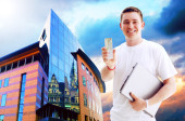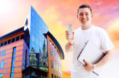 młody człowiek szczęśliwy lub student z laptopa i telefon na biznes