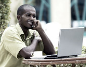 młody człowiek szczęśliwy lub student z laptopa i telefon na biznes
