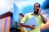 młody człowiek szczęśliwy lub student z laptopa i telefon na biznes