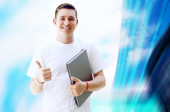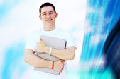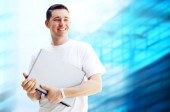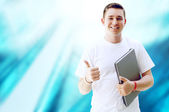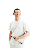 młody człowiek szczęśliwy lub student z laptopa i telefon na biznes