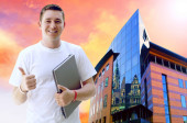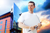biznesmen szczęścia na tle architektury biznesu