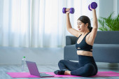 Zdjęcie "Portret sport piękno ciało szczupła kobieta w odzieży sportowej siedzi relaks i dziewczyna ćwiczy jogę i zrobić ćwiczenia fitness z laptopem komputera w sypialni w domu.Diet concept.Fitness i zdrowe" może być wykorzystywane do celów osobistych i komercyjnych zgodnie z warunkami zakupionej licencji Royalty-free. Obraz jest dostępny do pobrania w jakości wysokiej rozdzielczości do 5760x3840.