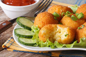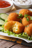 krokiety ziemniaczane z sałaty i ogórka na górze widok pionowy