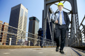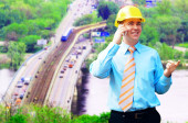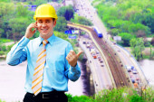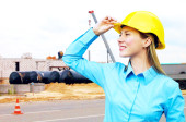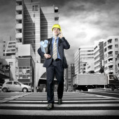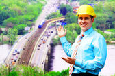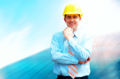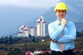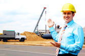 młody architekt sobie stały kask ochronny na konstruk