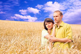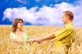 para młoda miłość uśmiechający się pod błękitne niebo