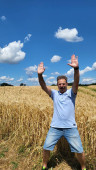 szczęśliwy człowiek na polu pszenicy złoty i niebieski niebo