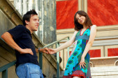 piękna młoda para z aparatu fotograficznego na białym tle na biały backgrou