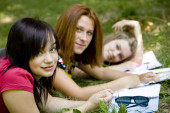 dwie dziewczyny odrabiania lekcji w parku.