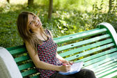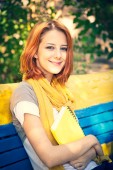 rudowłosy dziewczyna w okularach odrabiania lekcji w parku.