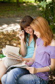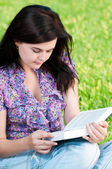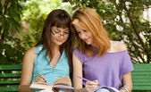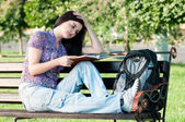 rudowłosy dziewczyna w okularach odrabiania lekcji w parku.