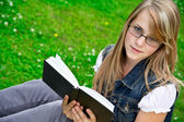 rudowłosy dziewczyna w okularach odrabiania lekcji w parku.