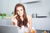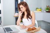 Uśmiechnięta młoda kobieta za pomocą laptopa