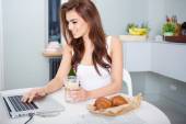 Uśmiechnięta młoda kobieta za pomocą laptopa