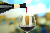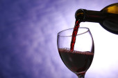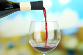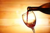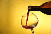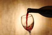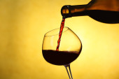 Wlewanie czerwonego wina z butelki do szklanki na kolorowe tło