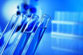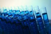 Naczynia laboratoryjne z błękitnym płynem na jasnym tle