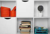 Regały z książkami i przedmioty dekoracyjne na tle ściany Cegła