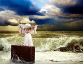 dziewczynka siedzi na sztuka bagażu na platformie kolejowej