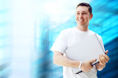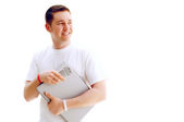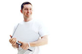 młody człowiek szczęśliwy lub student z laptopa i telefon na biznes