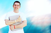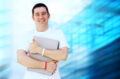 młody człowiek szczęśliwy lub student z laptopa i telefon na biznes
