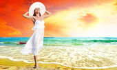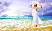 młode piękne kobiety w bieli z Pareo robione na słoneczny tropi