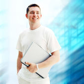 młody człowiek szczęśliwy lub student z laptopa i telefon na biznes
