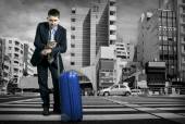 Young woman waiting on the road with her vintage baggage