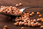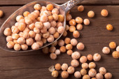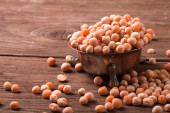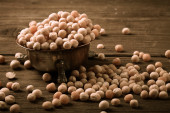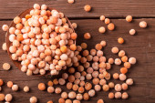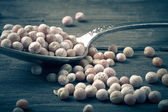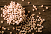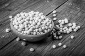 gliniane miski z suszony groch na starym drewnianym stole.