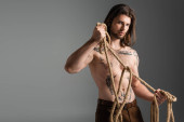 Shirtless tattooed man holding rope and looking away isolated on grey