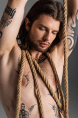 Young tattooed and shirtless model posing with rope isolated on red