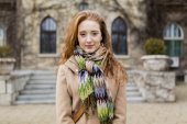 Rudowłosa modelu pozowanie na zewnątrz przy ulicy na wiosnę