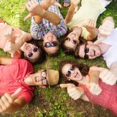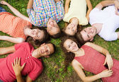 młode chłopaki i dziewczęta, leżąc na trawie patrząc