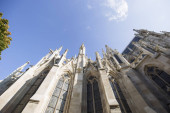 Low angle view of ancient St. Patrick's Cathedral on street in New York City