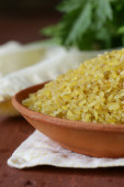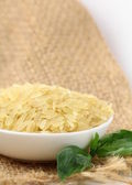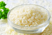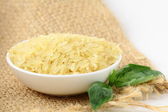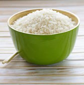 Naturalny organiczny biały ryż w misce na tle drewniane