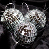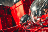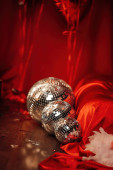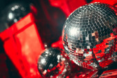 Glossy mirror balls in extravagant atmosphere interior decoration at vivid red background glamour. Beautiful place for saint valentines holiday with disco balls in romantic burlesque bedroom