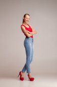 Młoda dziewczyna nagie footed huśtawka patrząc w aparacie
