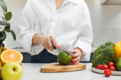 Zdjęcie "Młoda atrakcyjna kobieta stoi w kuchni przy stole ze świeżymi warzywami i zielonym smoothie. Zdrowe odżywianie." może być wykorzystywane do celów osobistych i komercyjnych zgodnie z warunkami zakupionej licencji Royalty-free. Obraz jest dostępny do pobrania w jakości wysokiej rozdzielczości do 5760x3840.