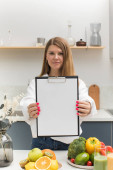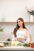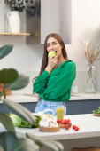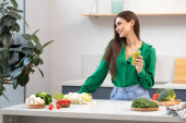 Młoda atrakcyjna kobieta stoi w kuchni przy stole ze świeżymi warzywami i zielonym smoothie. Zdrowe odżywianie.