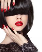 Zdjęcie "Czerwone usta makijaż i paznokcie manicure Polski. Brunetka wom moda" może być wykorzystywane do celów osobistych i komercyjnych zgodnie z warunkami zakupionej licencji Royalty-free. Obraz jest dostępny do pobrania w jakości wysokiej rozdzielczości do 5760x3840.