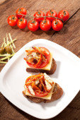 Zdjęcie "Bruschetta z pomidorami, szynką i serem" może być wykorzystywane do celów osobistych i komercyjnych zgodnie z warunkami zakupionej licencji Royalty-free. Obraz jest dostępny do pobrania w jakości wysokiej rozdzielczości do 5760x3840.