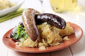 Zdjęcie "Pieczone kiełbaski z kapustą i ziemniakami" może być wykorzystywane do celów osobistych i komercyjnych zgodnie z warunkami zakupionej licencji Royalty-free. Obraz jest dostępny do pobrania w jakości wysokiej rozdzielczości do 5760x3840.