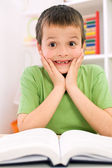 szczęśliwe dziecko z podręczników szkolnych, siedząc na podłodze