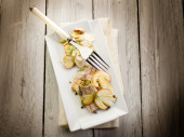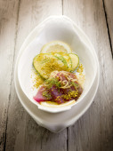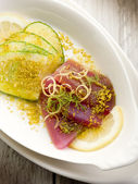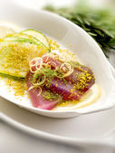 carpaccio z tuńczyka z plasterkiem ogórka i grind pistacja