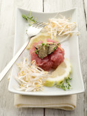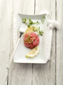 Zdjęcie "Tatar z tuńczyka z kapusta trufla i soi" może być wykorzystywane do celów osobistych i komercyjnych zgodnie z warunkami zakupionej licencji Royalty-free. Obraz jest dostępny do pobrania w jakości wysokiej rozdzielczości do 5760x3840.