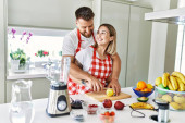 Młoda para uśmiecha się pewnie robiąc koktajl za pomocą miksera w kuchni